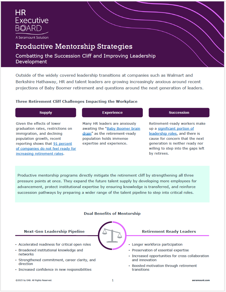 As retirement rates accelerate, many organizations are facing a growing succession cliff, with too few leaders ready to step into critical roles and essential expertise at risk of being lost. This guide explores how productive mentorship programs can help HR leaders strengthen leadership pipelines while preserving institutional knowledge.